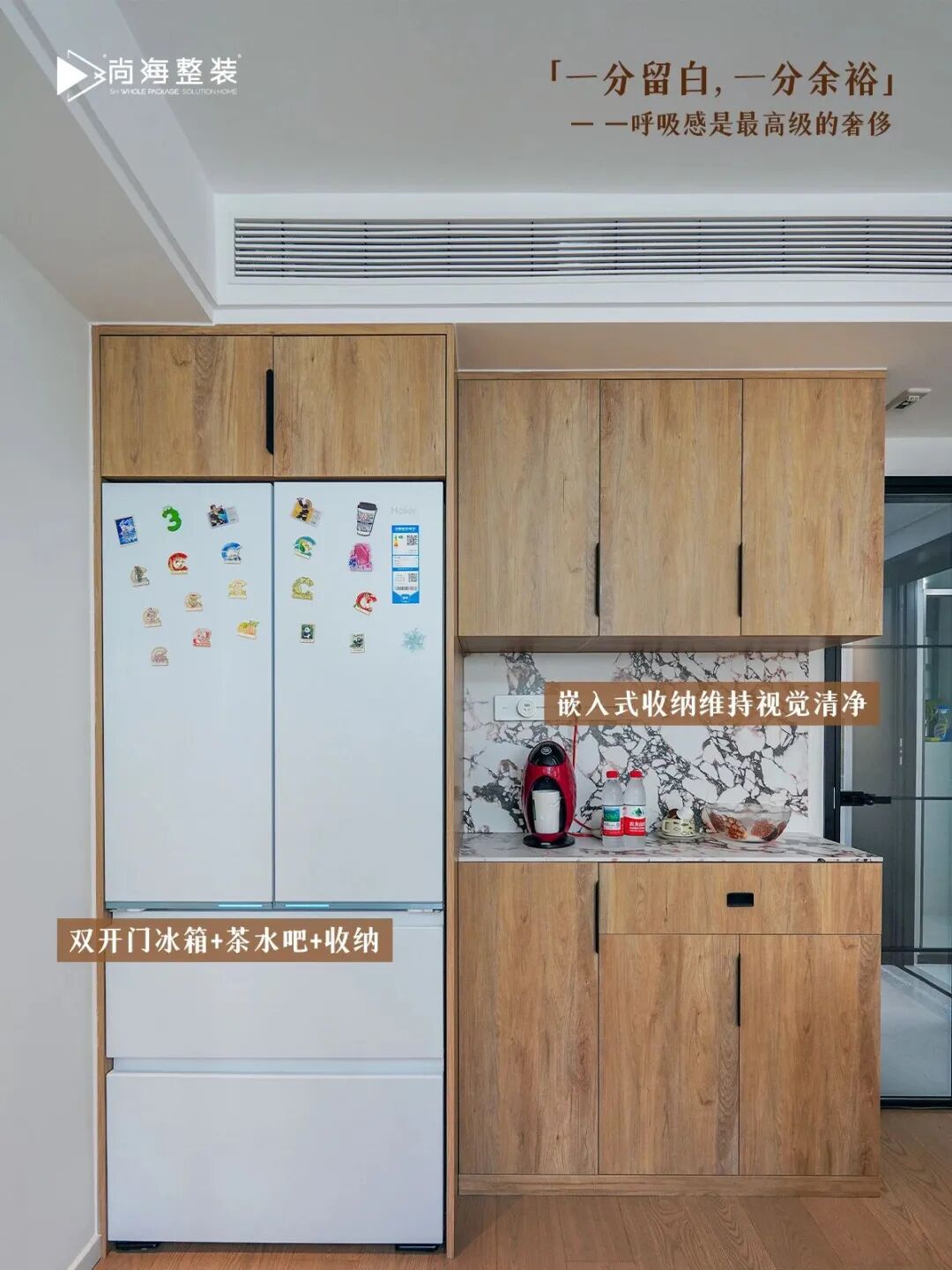 ▪️ 将双开门冰箱挪出厨房,结合定制柜做内嵌设计,严丝合缝的施工让立面空间层次拉满不杂乱。